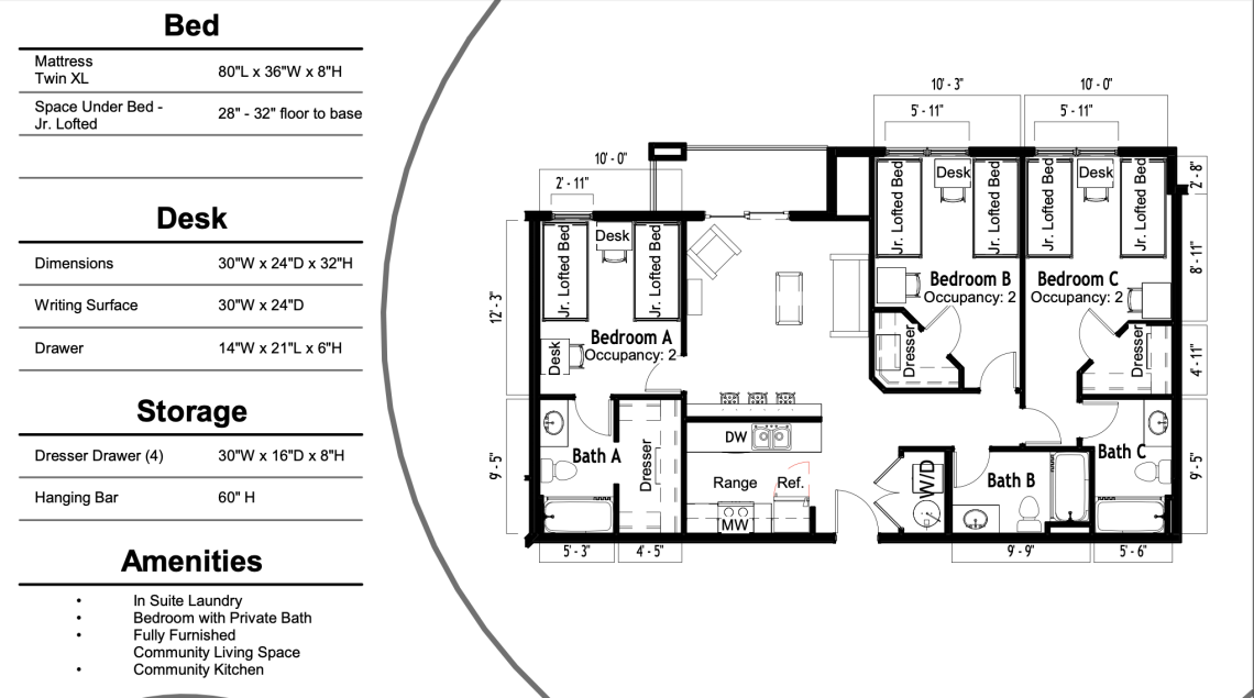 Kitchen: If you signed up to live in a apartment style dorm building, it will be located in your living room and shared with one to four roommates or suitemates, depending on your housing assignment. For those living in a traditional building, the kitchen will be located on the first floor or in the paired building next door. Please note that kitchens are not supplied with cooking items; guests are responsible for bringing their own supplies and cleaning up after use.