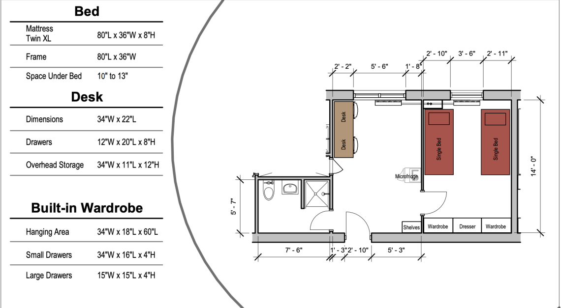 You should bring bedding for an extra-long twin bed, any toiletries and bathroom linens, clothes hangers, and any dishes, cookware, glasses, and silverware you'll plan to use in the community kitchen.